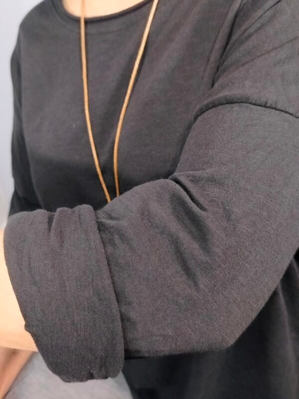 El detalle que la hace especial es su versatilidad: puedes llevarla con manga larga o recogerla al codo para un look más desenfadado. Además, incluye un colgante que complementa su diseño sin que tengas que pensar en accesorios extra. Su costura en la manga no solo aporta un acabado limpio, sino que también permite un ajuste más natural al brazo.